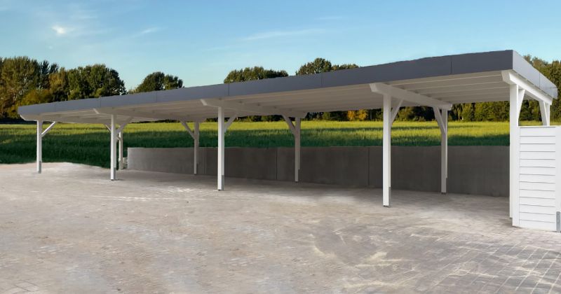 Carport-Reihenanlagen für Mehrfamilienhäuser, Wohnanlagen und Eigentümergemeinschaften jeder Art sind meist effiziente Flachdach-Modelle. Für gehobene Ansprüche ist jede Bau- und Dachform als Reihenanlage darstellbar. Je nach örtlichen Gegebenheiten sind freistehende, Anlehn- oder Anbau-Ausführungen sowie Carports zwischen zwei Häusern möglich.