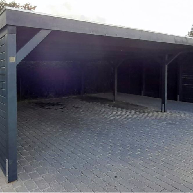 Die einfache Konstruktion einer Flachdach-Anlage eignet sich zum Selbstaufbau. Das Flachdach wird mit einem minimalen Gefälle montiert, damit Regenwasser direkt in die integrierte Rinne ablaufen kann. Der schräge Verlauf wie auch die Rinnen werden durch die Sparren und/oder Blenden vollständig verdeckt. Anstelle der vorderen Pfosten können Sie sich für Leimholzbögen entscheiden, die das Einparken deutlich vereinfachen. Seitenwände und Abstellräume lassen sich ideal integrieren. Auch gemeinschaftliche Stellflächen, beispielsweise für Mülltonnen, können flexibel ergänzt werden. Das A+W Carportwerk liefert Standardmodelle ebenso wie individuell vermessene Ausführungen.