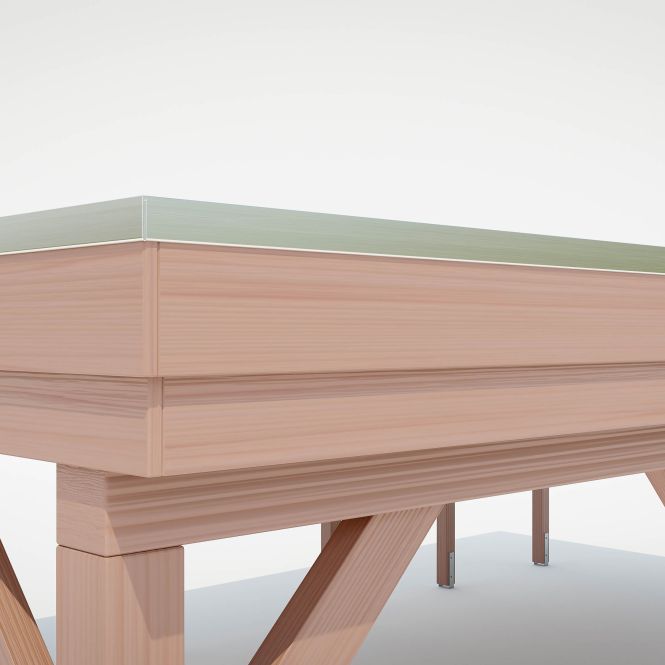 Bei den meisten Modellen empfehlen wir Ihnen wasserfest verleimtes Fichten-Brettschichtholz oder Douglasie-Vollholz. Kesseldruckimprägniertes Kiefernholz (KDI) ist erhältlich, schützt jedoch nicht dauerhaft vor Witterungseinflüssen. Alle Hölzer beziehen wir von ausgesuchten heimischen Sägewerken (gem. Tegernseer Gebräuchen), fachgerecht gehobelt und gefast.
