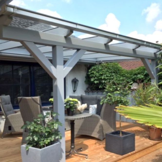 Die Pfosten sind verschraubt in H-Ankern oder eleganten, nicht sichtbaren Ankern, eingelassen in einem geeigneten Fundament oder – bei ausreichender Tragfähigkeit – direkt auf der Terrasse. Für die Gestaltung des Dachs gibt es viele Möglichkeiten. Schlagfestes Polycarbonat oder Verbundsicherheitsglas sind die beliebtesten Ausführungen. Ob das Dach mit einer Regenrinne abschließt, einer Blende oder offen bleibt, ist je nach Modell und Ihren Anforderungen variabel.